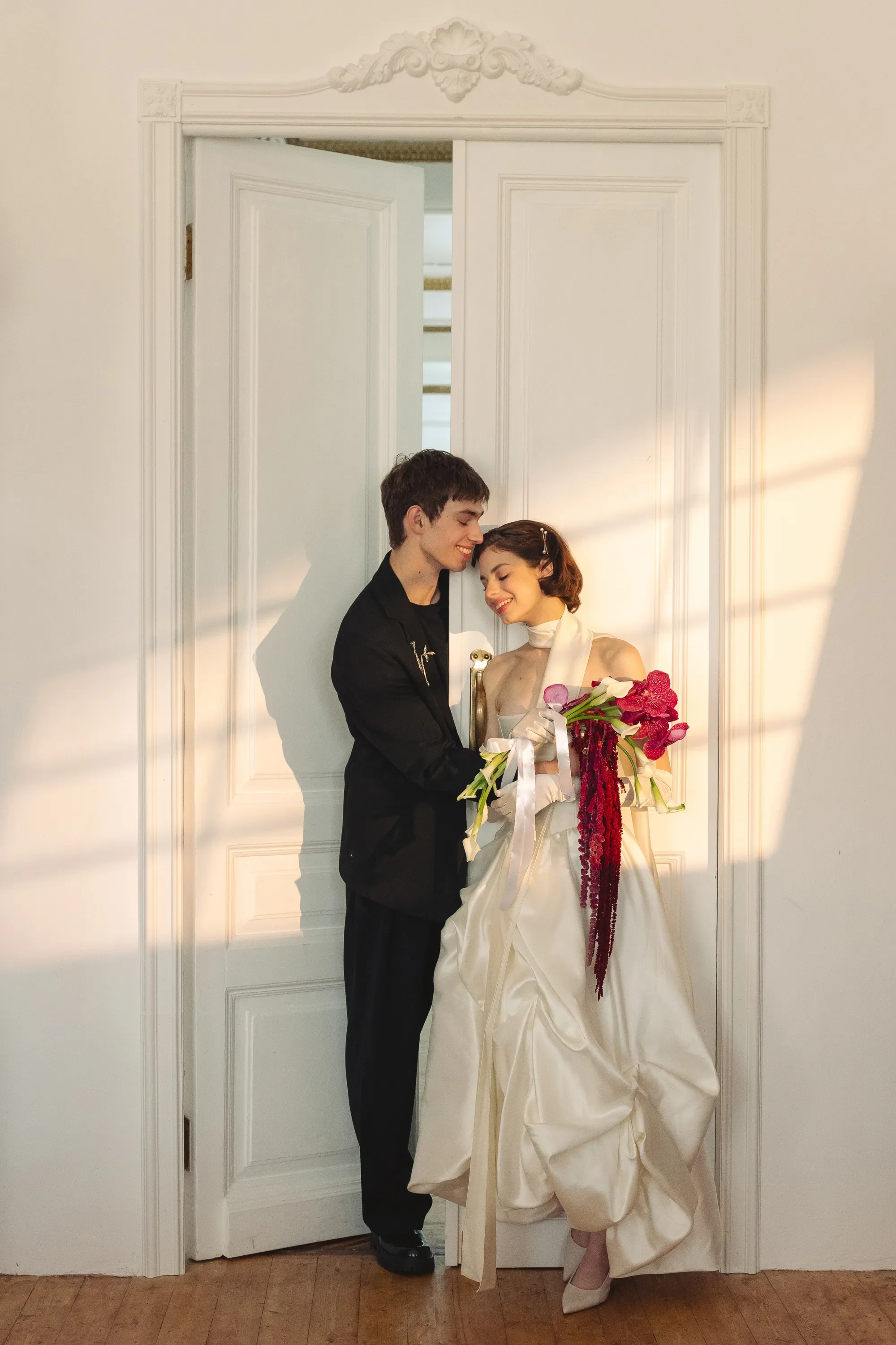 The rest of the styling remains minimal and refined, which allows the bouquet to become the focal point without overwhelming the overall look. The deep tones add richness, while the clean lines of the calla lilies keep it grounded and timeless.