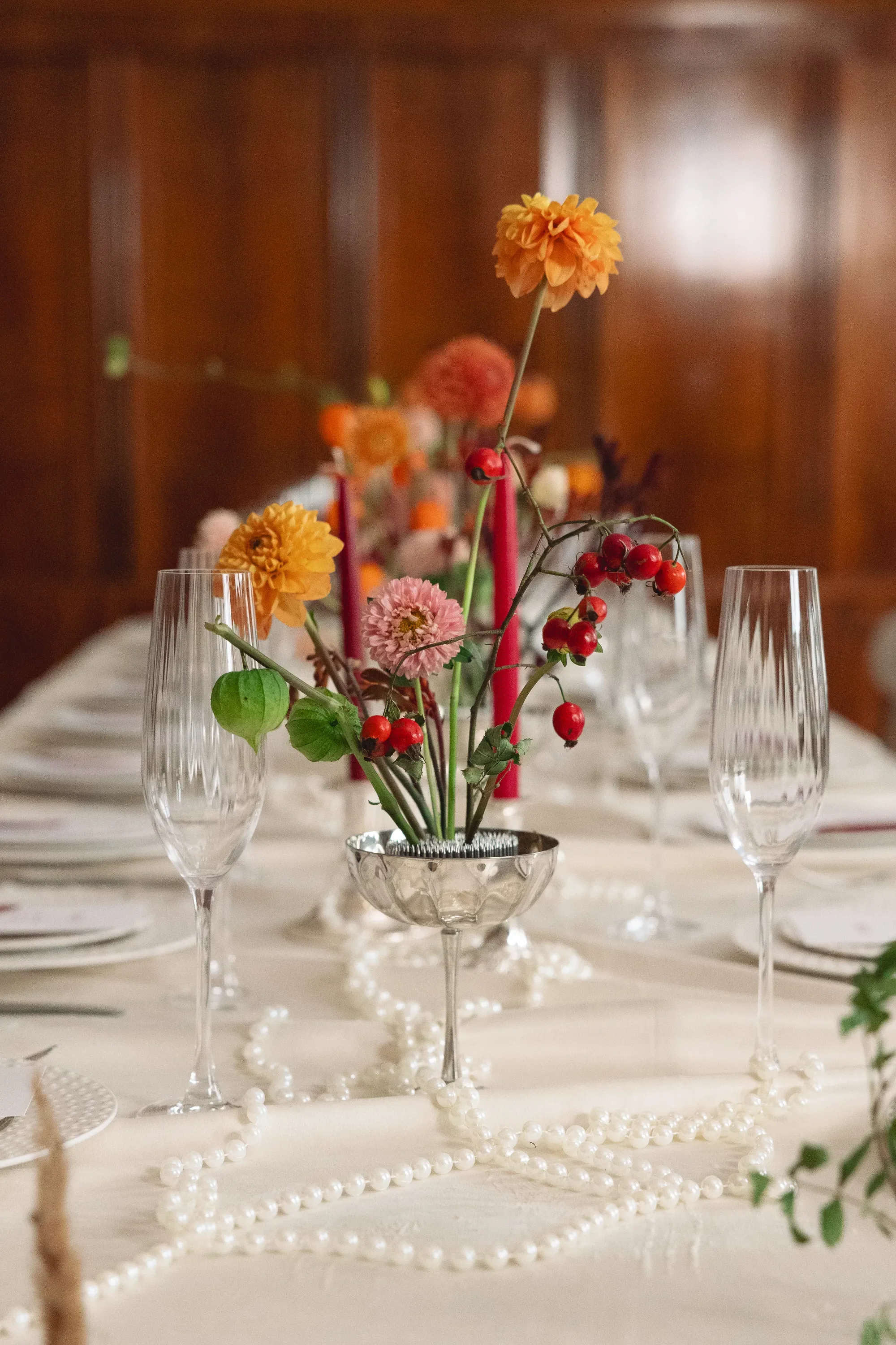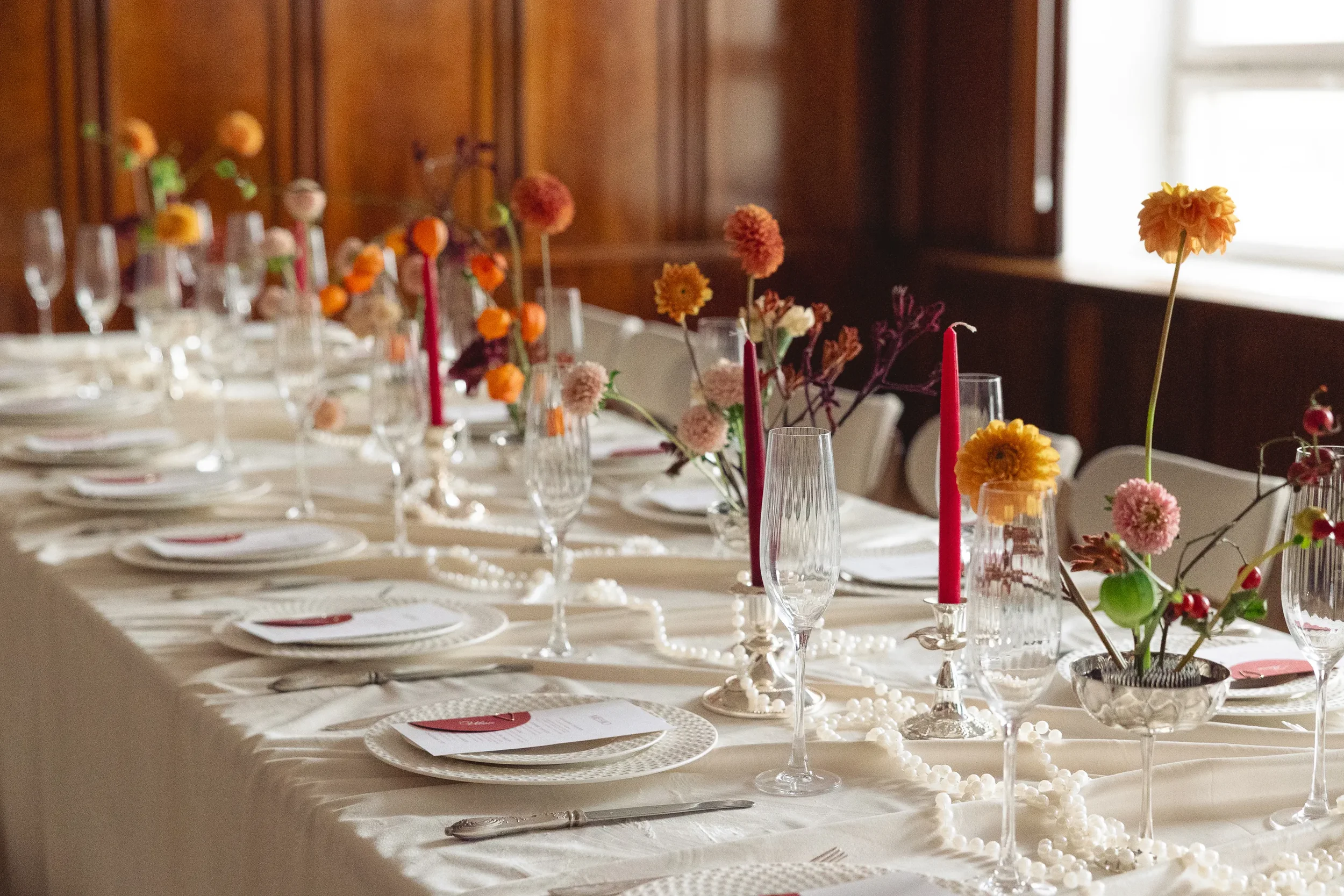 Table styling follows the same principle of balance. Crisp linens, delicate glassware, and carefully chosen accents like pearls or candles create depth without feeling cluttered.