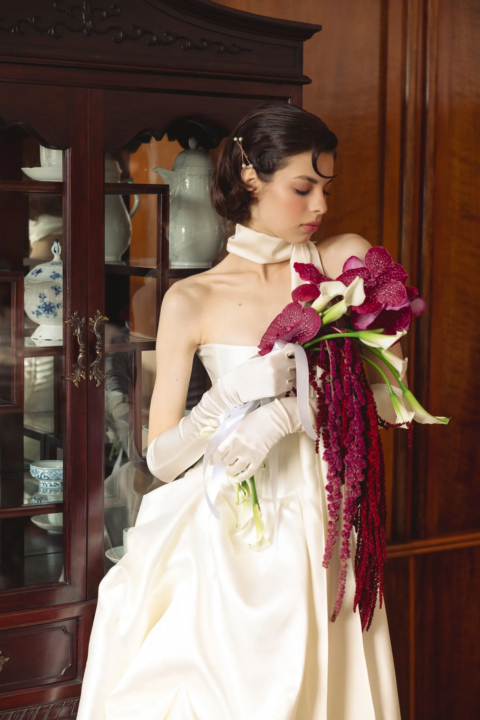 The bouquet in this look leans into a more sculptural, editorial style.It combines Vanda orchids, calla lilies, and cascading amaranthus to create a shape that feels fluid and intentional rather than traditional.